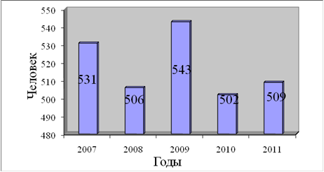 Для руководства предприятия важно располагать персоналом, который необходим для выполнения производственных задач. Этот персонал должен быть в определенное время, в определенном месте, в нужном количестве и соответствующей квалификации. Общая численность работающих - 509 человека, в том числе административно-управленческий персонал - 29 человек. Динамику изменения численности работающих ООО «Камилла» за 2007-2011 годы можно изобразить на графике (см. рис. 2.1.1).