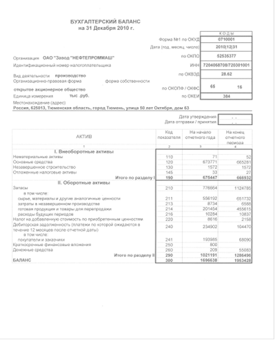 Бухгалтерский баланс ОАО «Завод «Нефтепроммаш» за 2010 год.